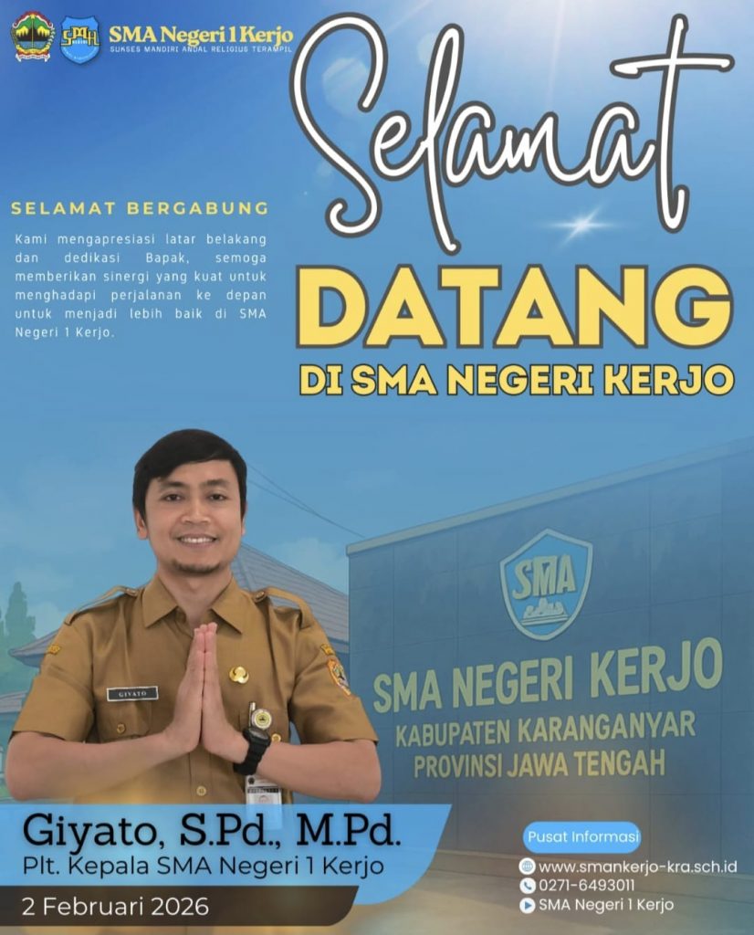 **Kerjo, Karanganyar —** SMA Negeri 1 Kerjo resmi menyambut **Giyato, S.Pd., M.Pd.** sebagai **Pelaksana Tugas (Plt.) Kepala SMA Negeri 1 Kerjo** terhitung mulai **2 Februari 2026**. Kehadiran beliau diharapkan mampu memperkuat sinergi seluruh warga sekolah untuk melanjutkan perjalanan sekolah menuju layanan pendidikan yang semakin berkualitas, berkarakter, dan adaptif terhadap perkembangan zaman.